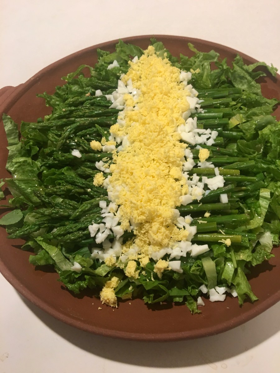 Asparagus vinaigrette with arugula and dandelion, chopped egg