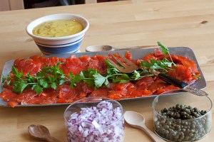 Place the smoked, peeled peppers on a cutting board and cut them into bite-sized pieces. Then place the pepper pieces, sliced garlic, salt, and peppercorns in a bowl that is deep enough to hold them comfortably. Add enough olive oil to cover the mixture, cover the bowl with plastic wrap, and let sit on a kitchen counter at room temperature. Two or three times each day for two days, turn the mixture, re-cover, and let marinate at room temperature. The peppers should be ready to serve with crackers or thin slices of bread so that each guest can spoon a pepper piece and a little olive oil on the cracker or bread and pop it into his or her mouth. The sliced garlic is good, too.