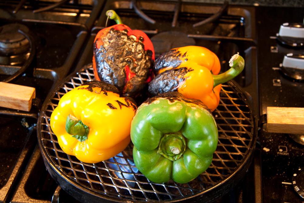 - 4 roasted bell peppers, preferably one each of green, red, yellow, and orange