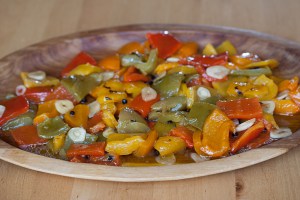 So here’s what you do: Turn your stove burner on high. A gas range works much better than electric. I’m not even sure if you can use radiant heat, because you need to get your grill red-hot. Put the grill over the flame and wait until the steel mesh begins to glow. Then arrange your chiles or bell peppers on top. You can fill up the grill, but don’t crowd it as the skin of every pepper needs to get blistering hot and char. Let the peppers sit undisturbed on the grill until the surface touching the grill has completely charred and turned black. Then turn the peppers to expose another surface. Keep charring and turning until the whole pepper is black. Don’t forget the ends. Put the charred peppers in a plastic bag that can be closed or sealed, and let them cool completely. If you have done your job correctly, the charred skin can be removed easily under a stream of running water. Peel the peppers, core them, and remove the seeds. You are now ready to make smoked peppers in garlic olive oil.