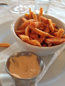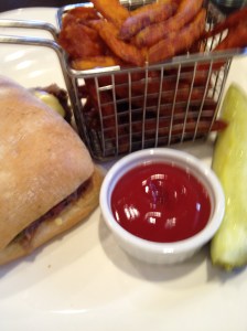 The day we visited for lunch, the place was busy but not crowded. Susan chose the baby back rib plate, and I chose the green chile chopped brisket sandwich – a new experience for me. The ribs came with real Southern greens and cornbread with just enough sugar to compromise between Yankees who like sugar and Southerners who don’t. The sandwich was good, too, although I think I prefer either a classic chopped brisket sandwich or an authentic green chile cheeseburger. For me, the highlight of the meal was the little fry basket filled with crispy sweet potato fries.