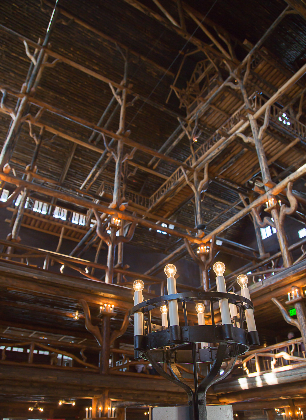 Looking up to the ceiling of the lobby at Old Faithful Inn