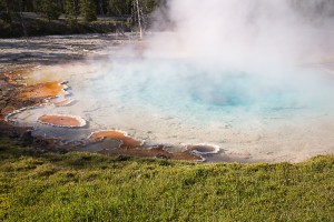 It is a several-hour drive from Glacier to Yellowstone, but the scenery is so absorbing that the time passes quickly. Montana is gorgeous, and there are many spectacular mountains beside those in Glacier. The plains are beautiful with rolling hills, great green pastures, and trim ranch houses. As we got closer to Yellowstone, the mountains and forests again took over the view, and we saw several of the famous and beautiful rivers that have inspired writers, painters, photographers, and fly fisherman from as far back as Lewis and Clark – The Yellowstone, the Gallatin, the Madison – and we would soon see the Fire Hole.