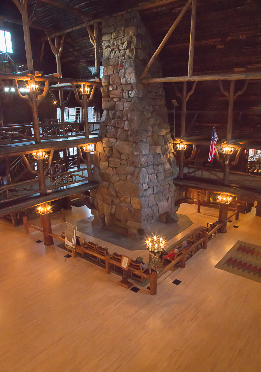 Back in the lobby, we gasped with the other tourists at the enormity of space. The log ceiling reached up many storeys  nearly 80 feet above the lobby floor with the massive stone fireplace serving as the focal point.