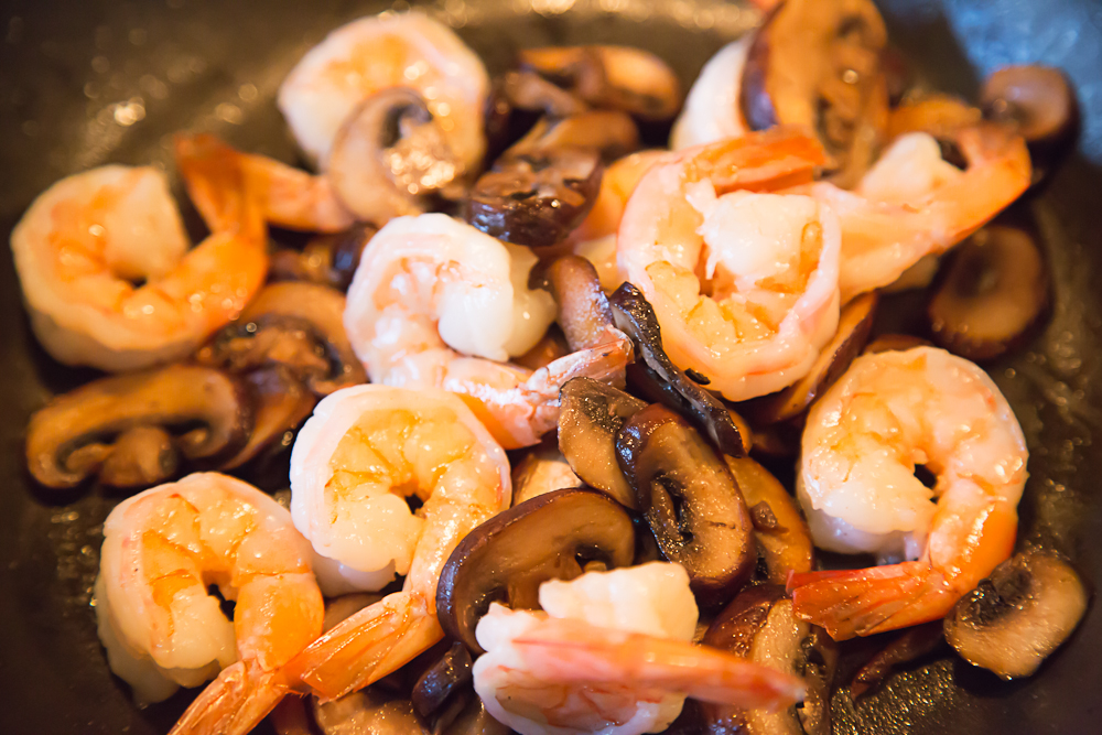 Shrimp and mushrooms sautéing