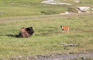 Mother American bison and calf