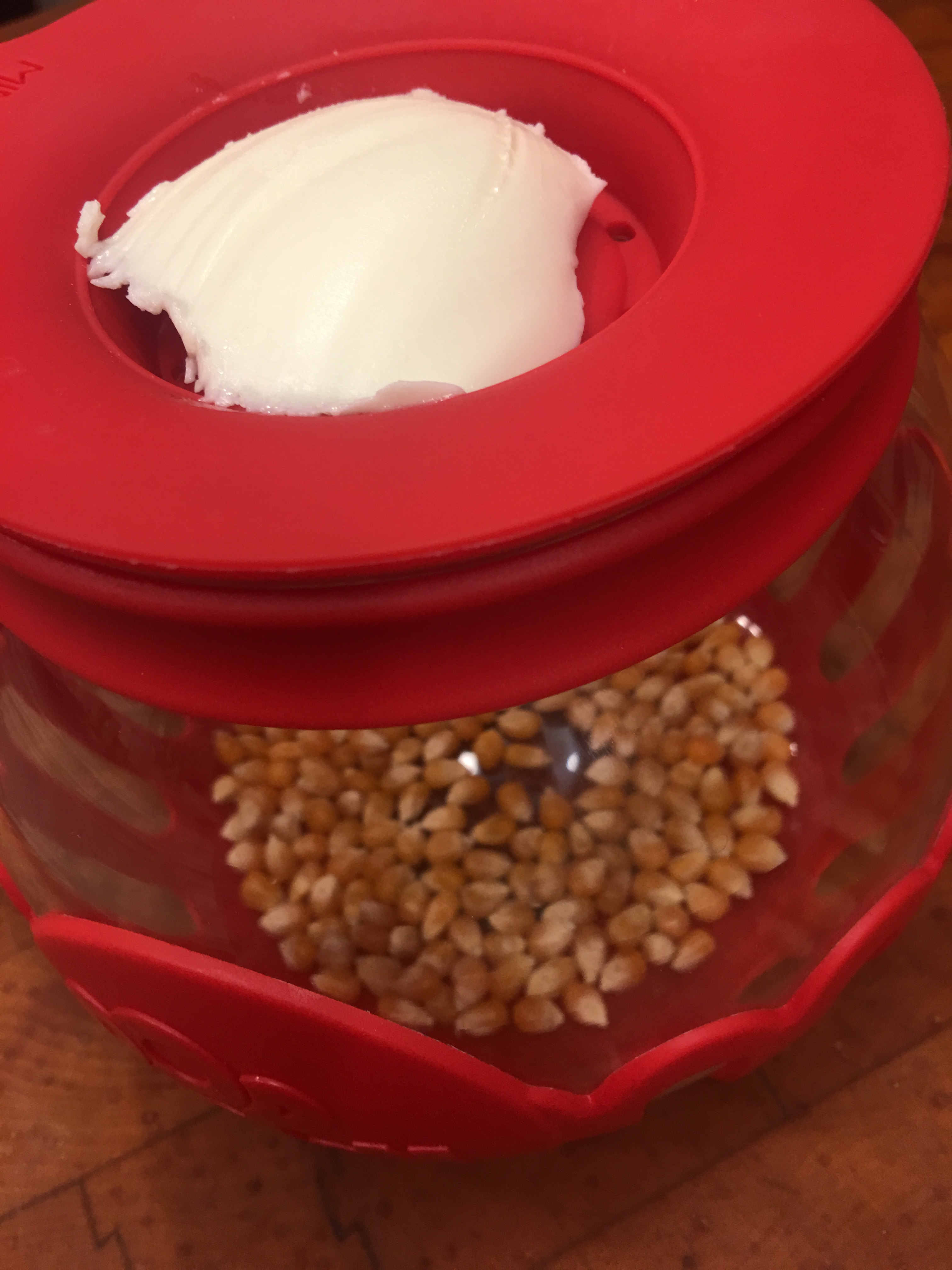 Butter on top, kernels in the popper