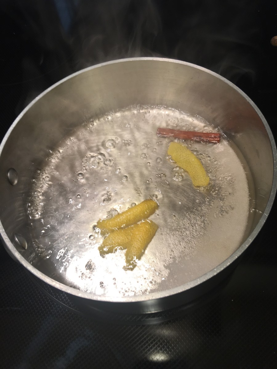 Boiling sugar, water, and flavorings before adding the cherries