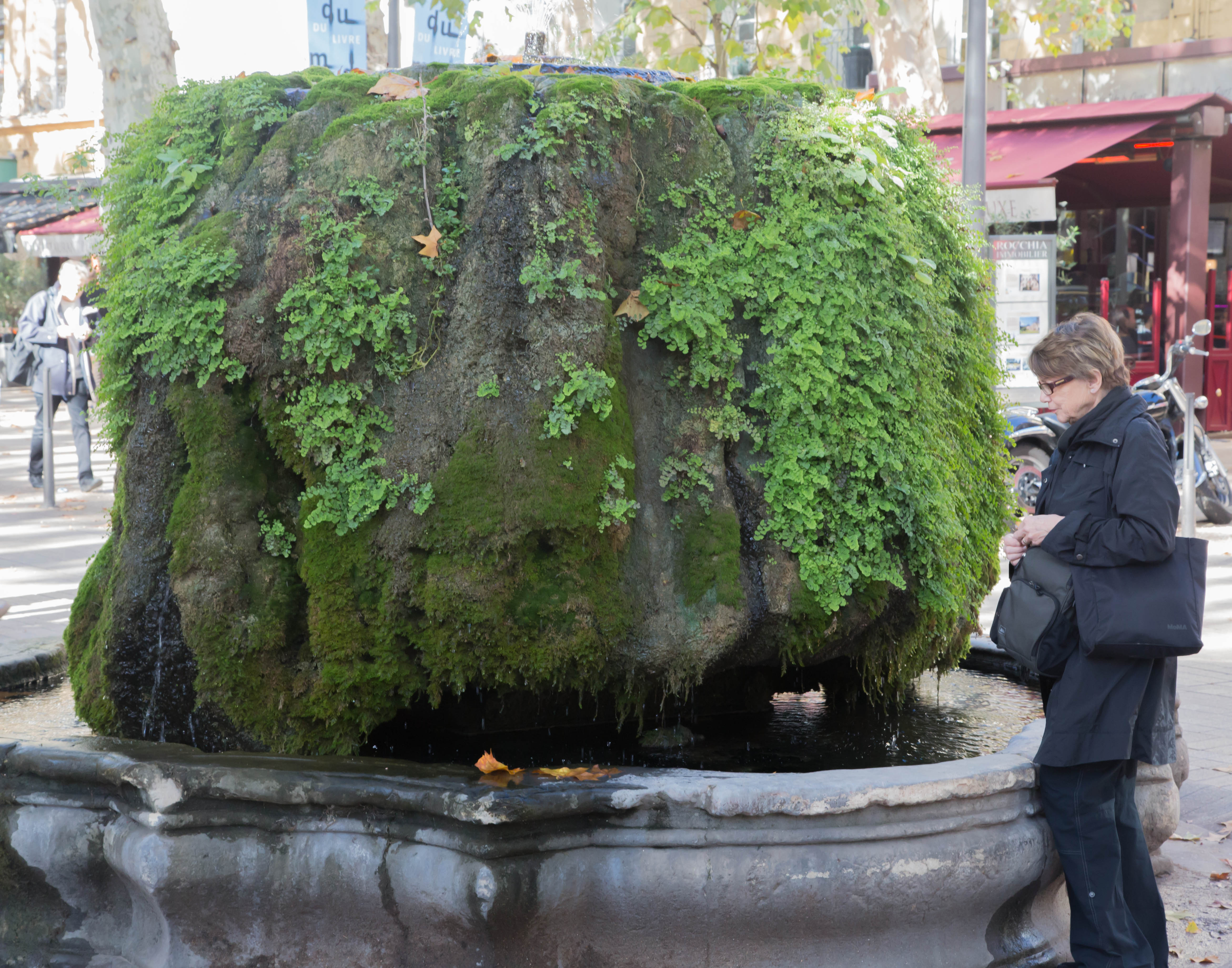 A moss and fern covered fountain in the middle of the Cours Mirabeau