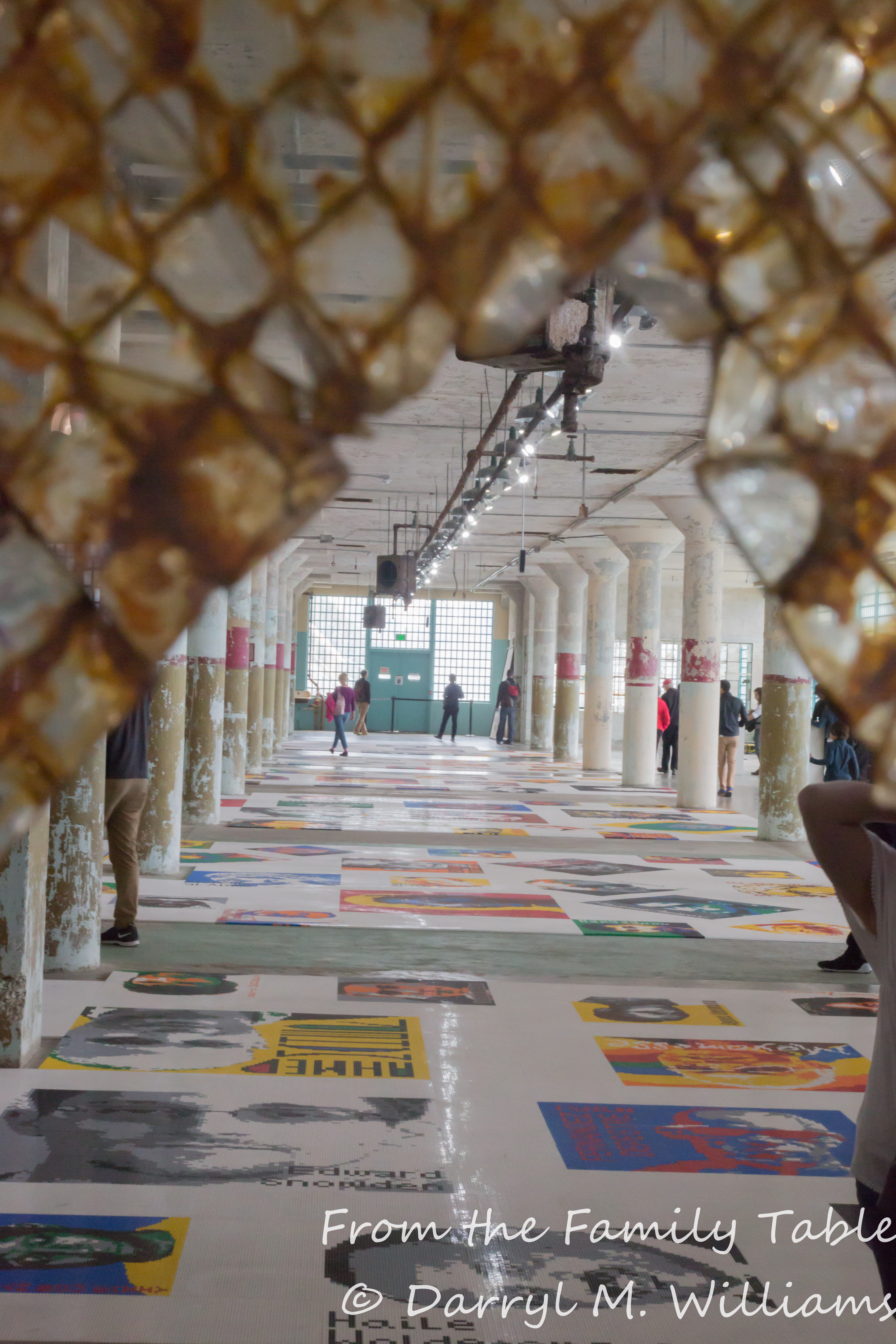 View through a broken window pane of the display of Lego portraits of political prisoners