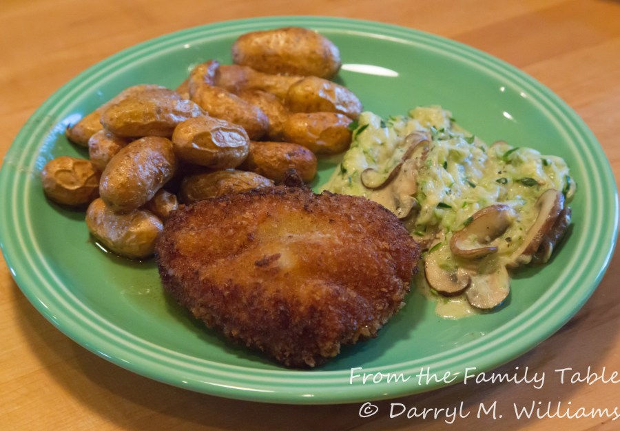 Brabant fingerling potatoes with panko-crusted eye-of-round and zucchini with mushrooms and sour cream