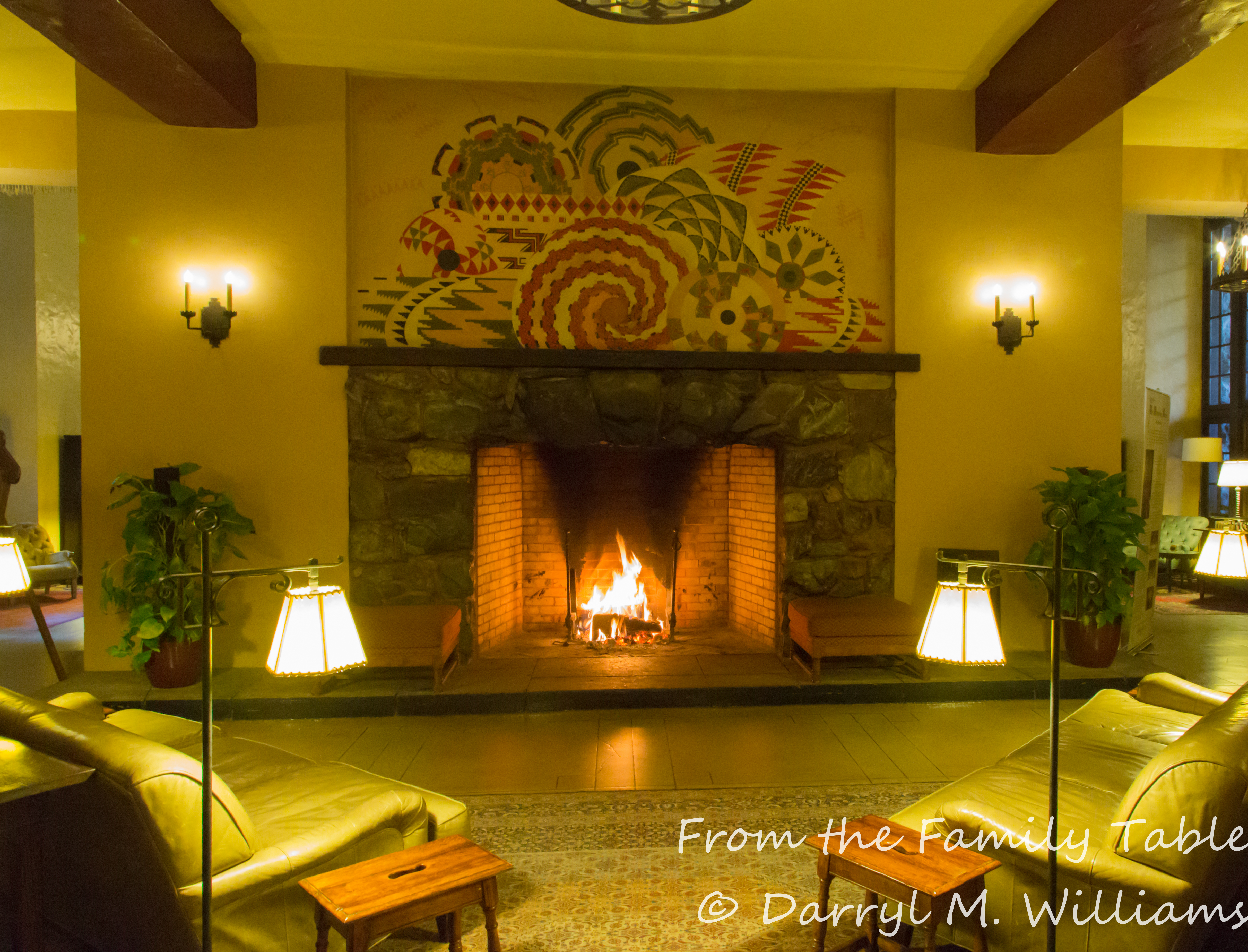 The warm fireplace in the lobby of the Ahwahnee Hotel