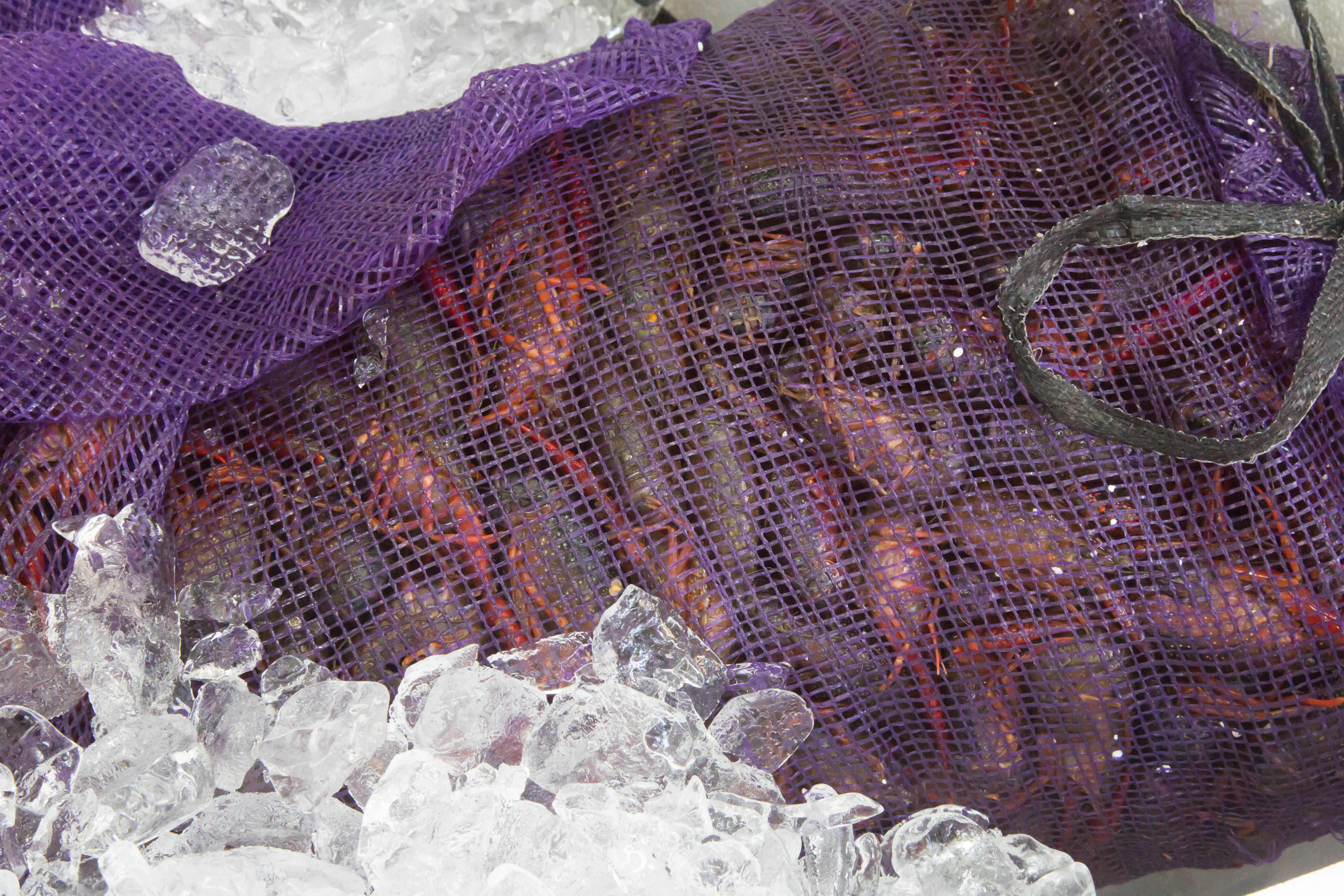 A sack of crawfish on ice