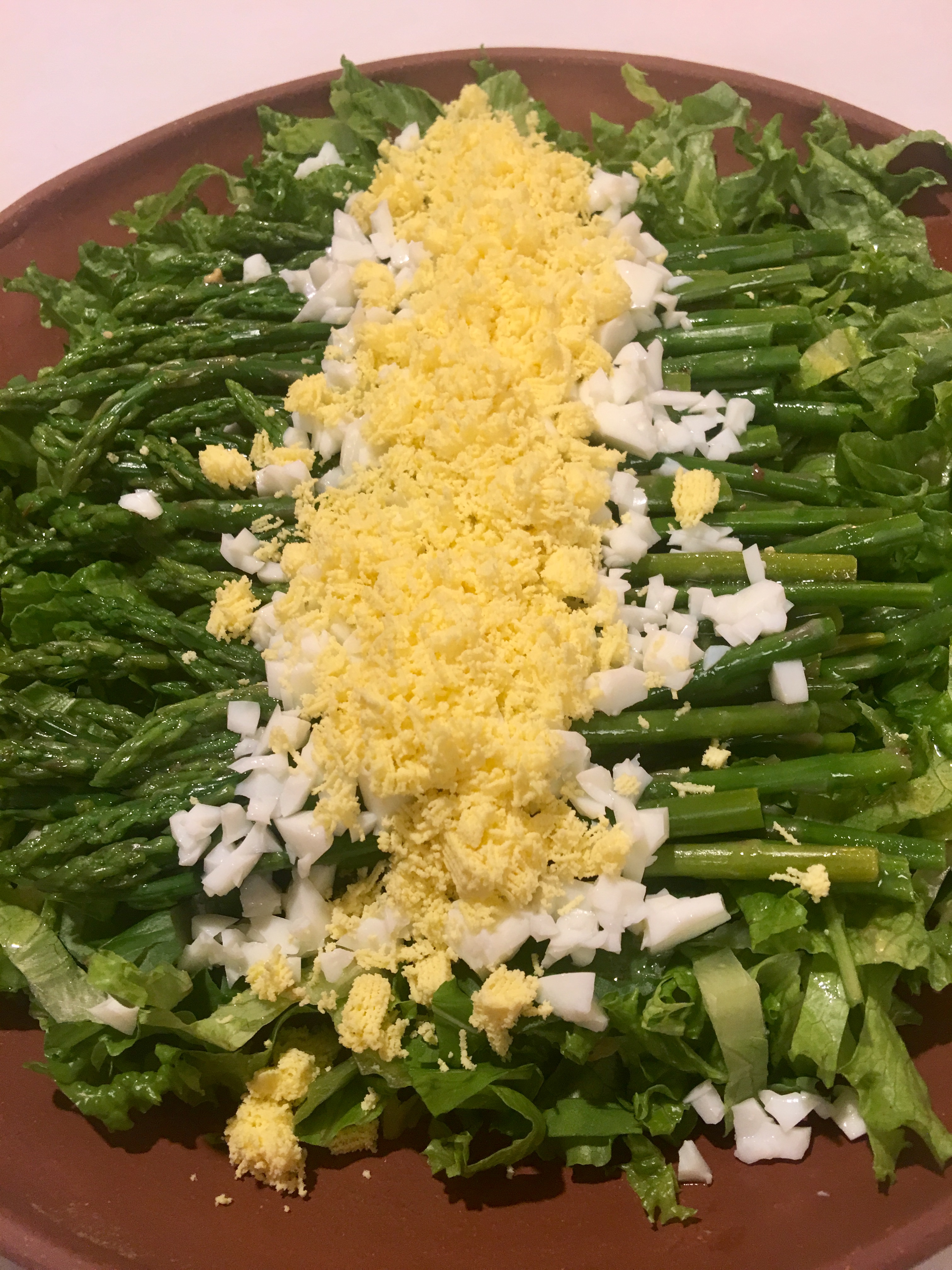 Asparagus vinaigrette with arugula and dandelion, chopped egg