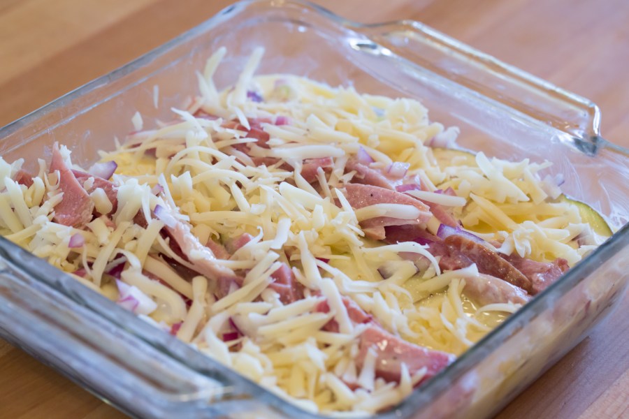 First layer of alternating rows of thin potato slices and ham, topped with onions and Swiss cheese