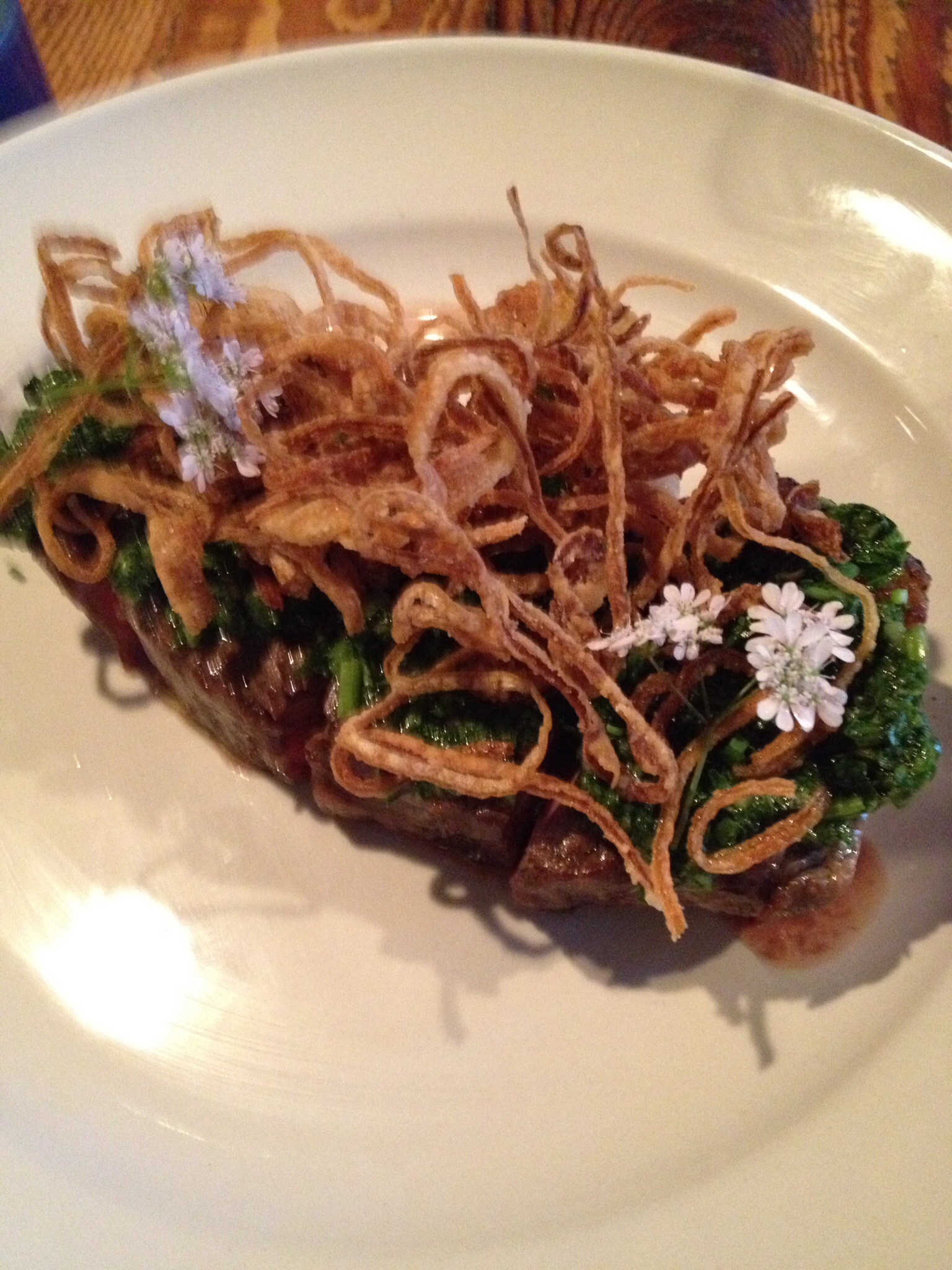 New York strip steak with broccoli chimichurri, crisp onions and coriander flowers