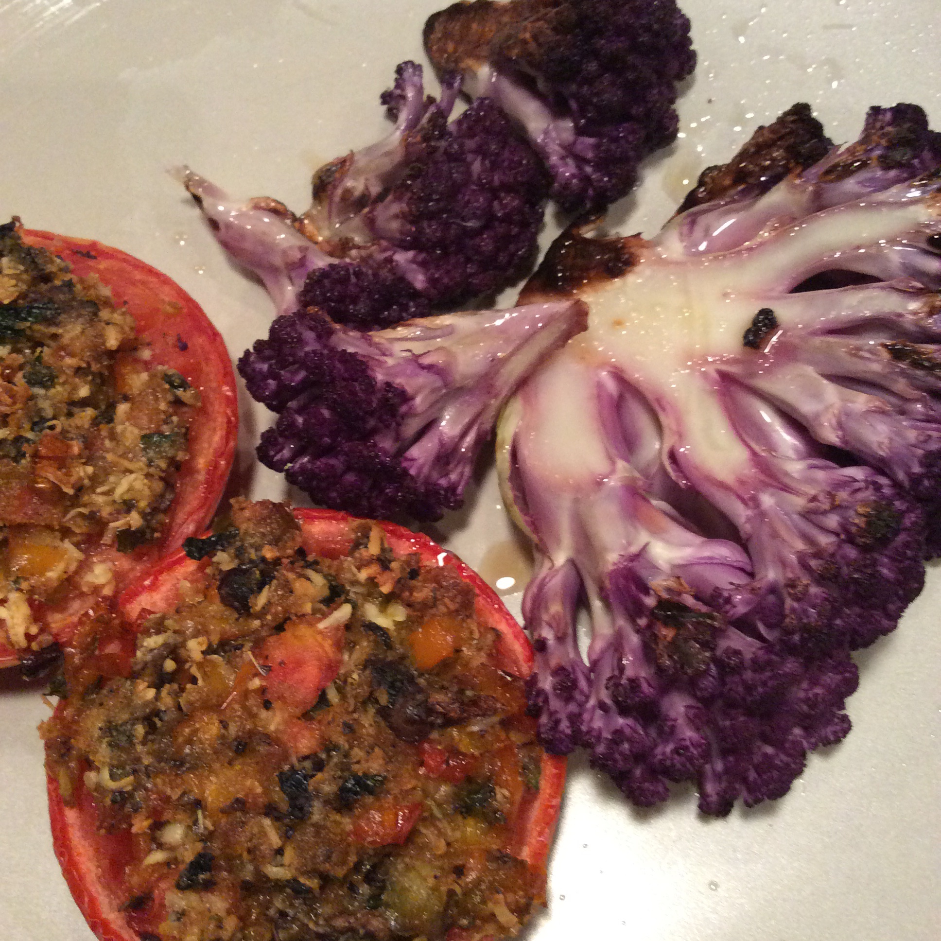 Grilled cauliflower “steaks” with roasted stuffed tomatoes