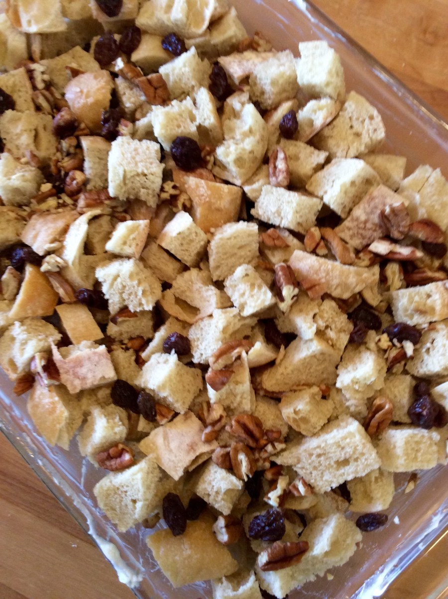 Bread cubes with raisins and pecans added, ready for the custard mixture.