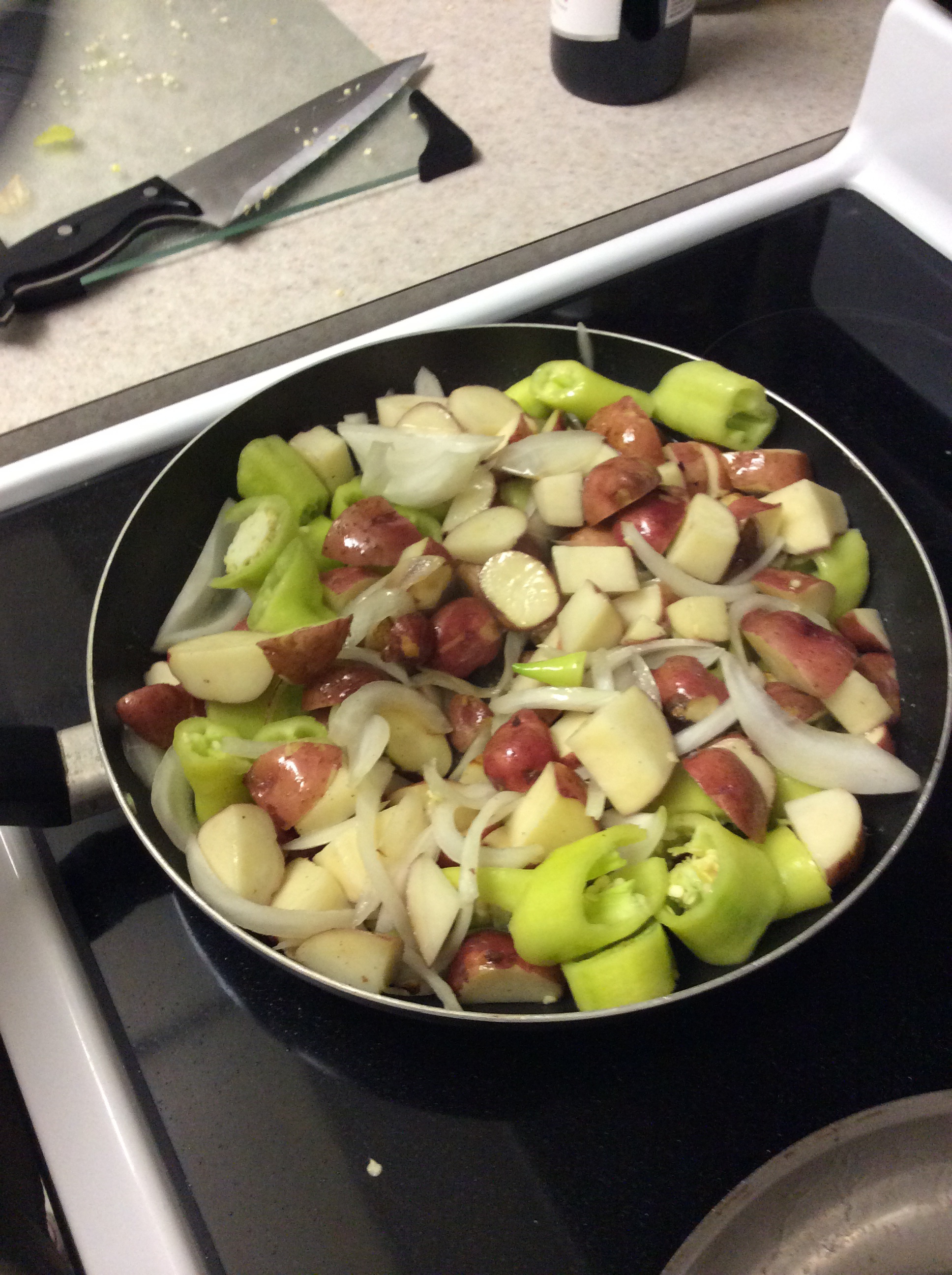 New potatoes, sweet yellow peppers, and onions