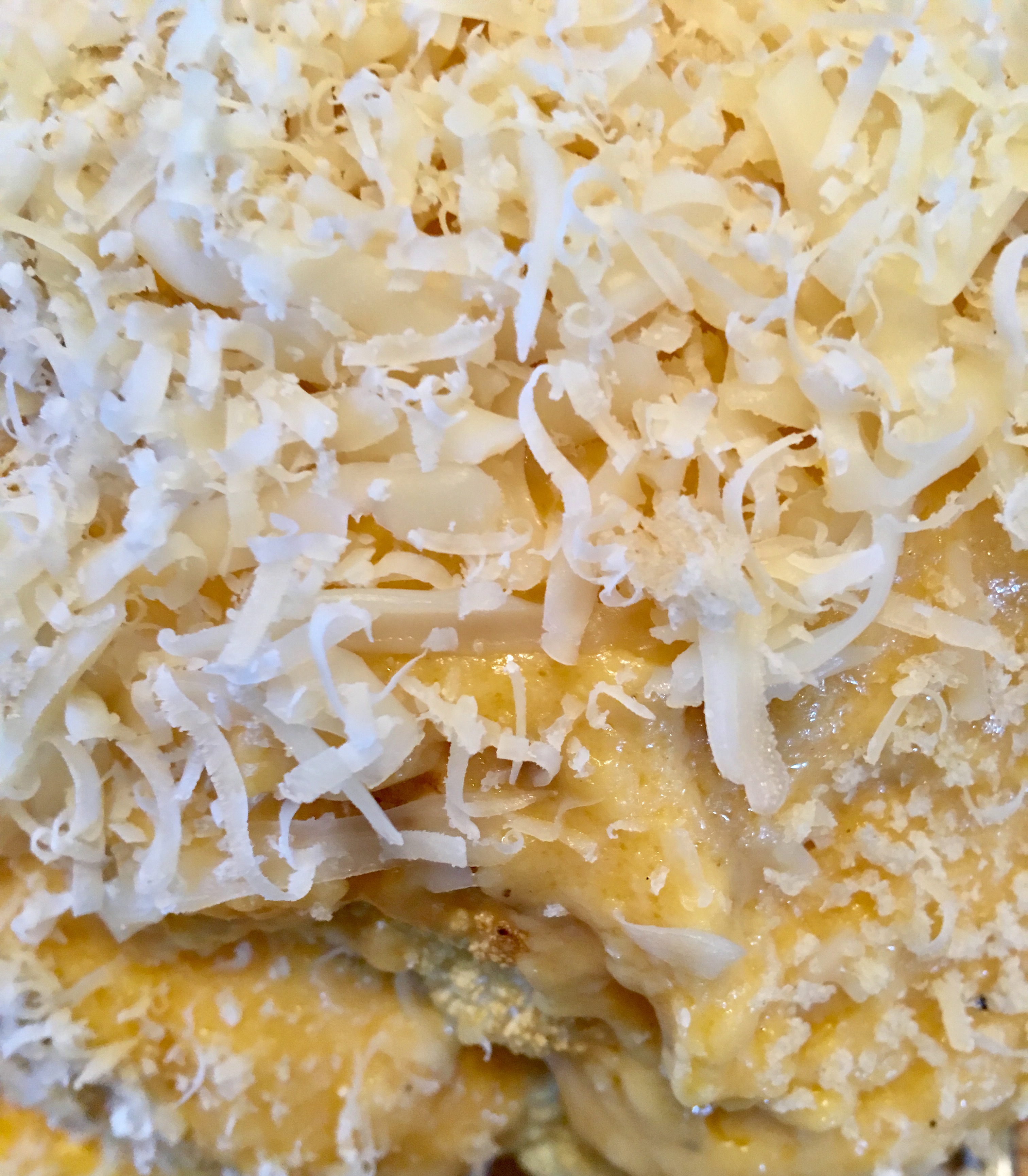 Roasted cauliflower topped with Cheddar cheese sauce, Swiss cheese, Parmesan, and panko