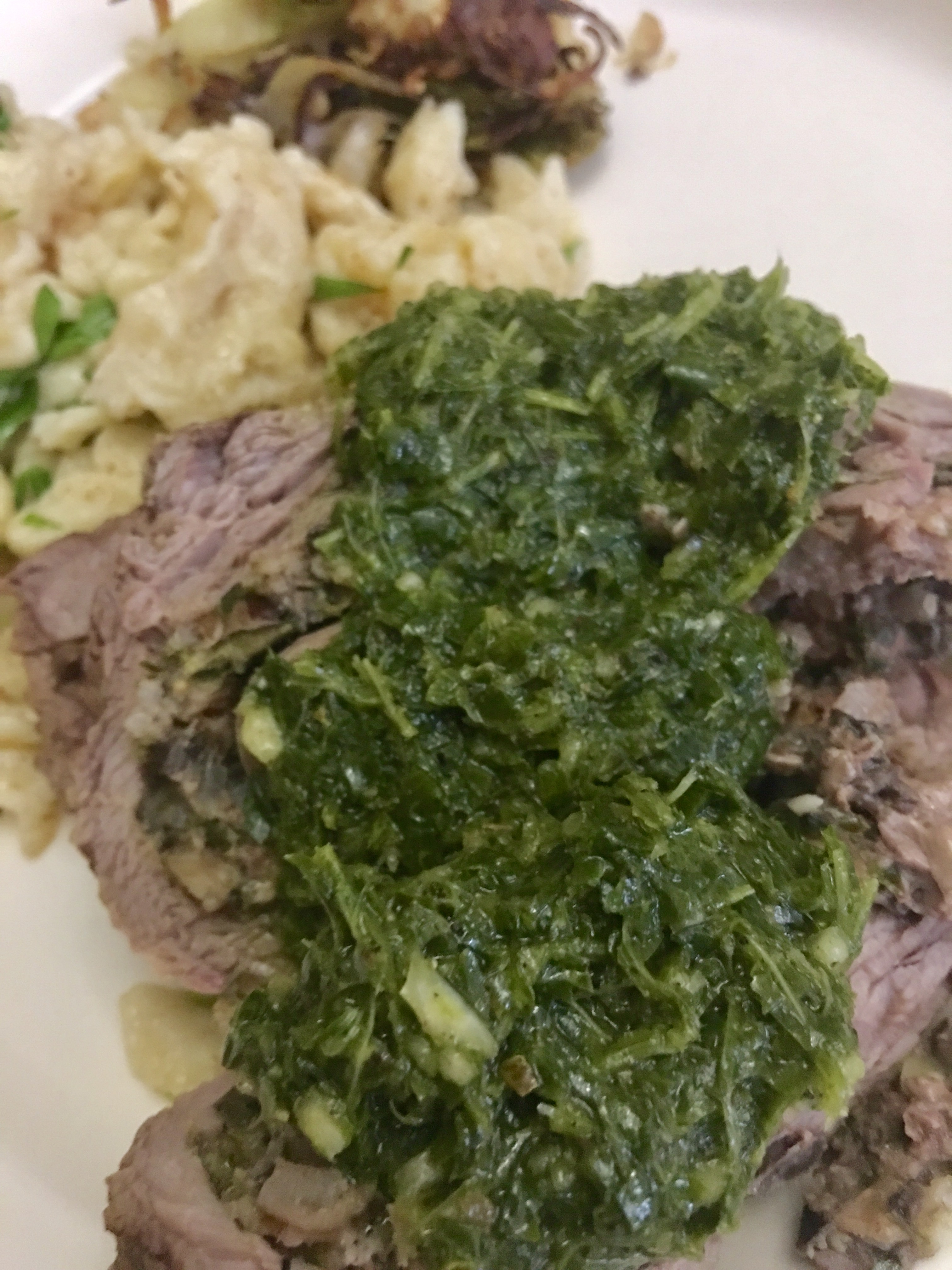 Rolled flanks steak topped with chimichurri