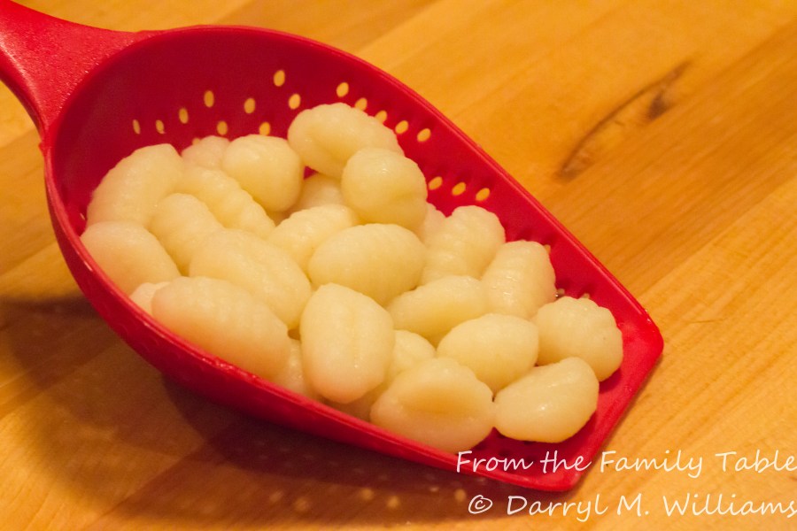 A scoop of cooked gnocchi ready for saucing