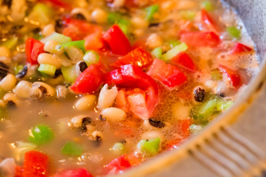 Fresh tomatoes and other vegetables added to the beans for the final simmer