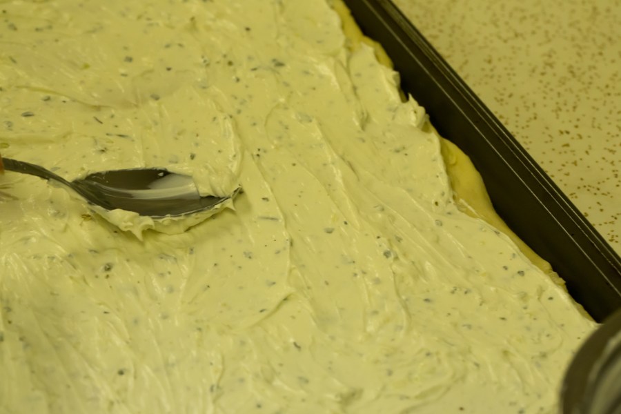 Spreading the cream cheese mixture on the puff pastry