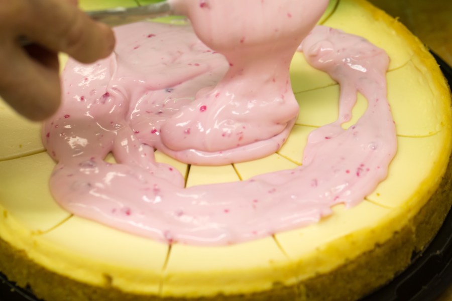 Topping going on the cheesecake