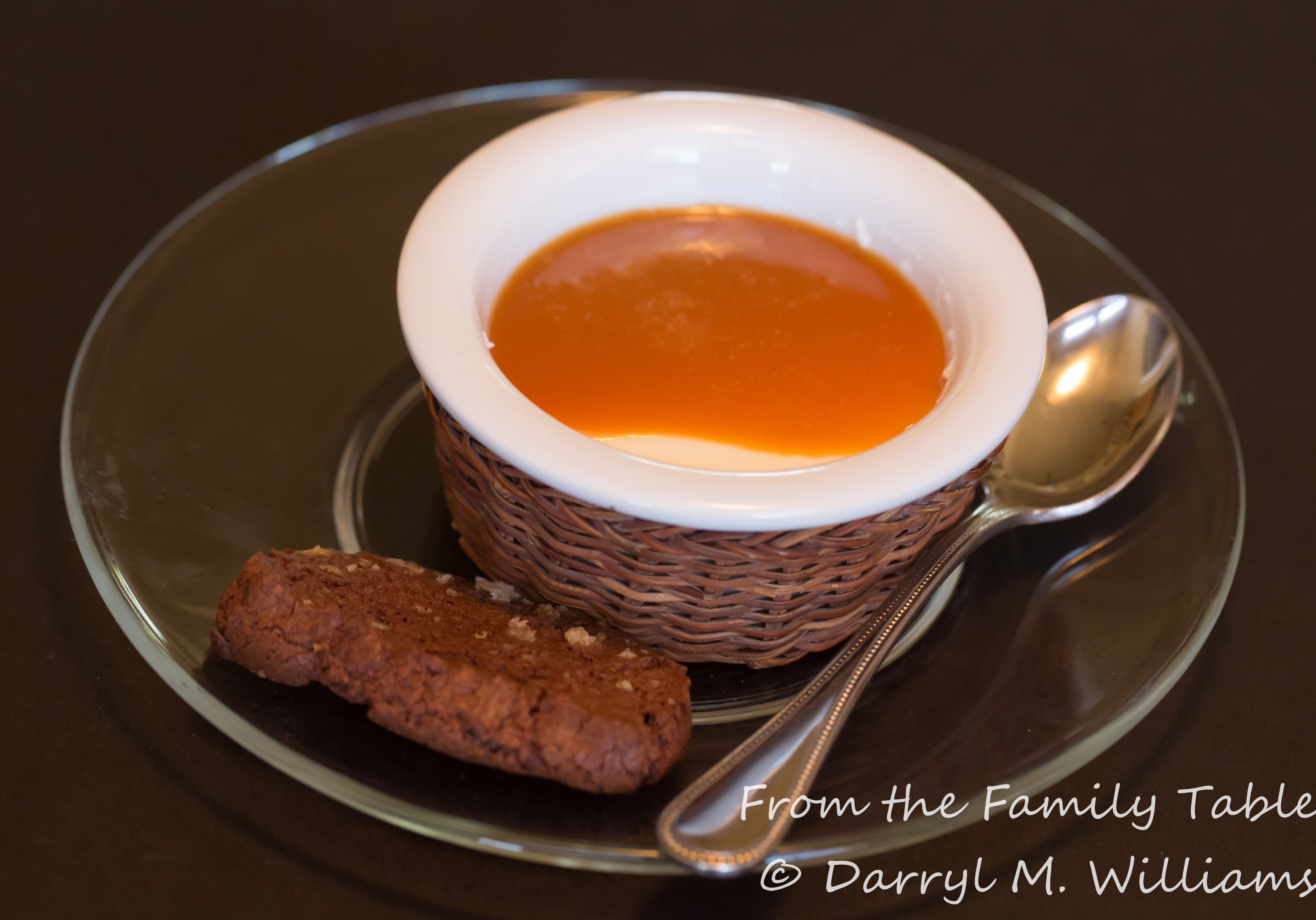 The finished dessert: ginger-scented panna cotta topped with cajeta and served with a sea-salt-sprinkled chocolate sablé