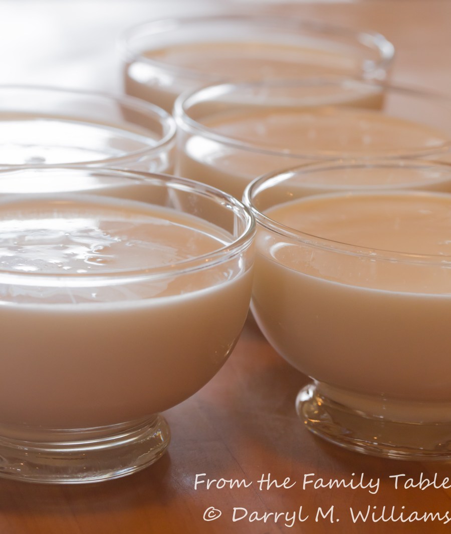 Panna cotta ladled into the serving dishes and ready to be chilled