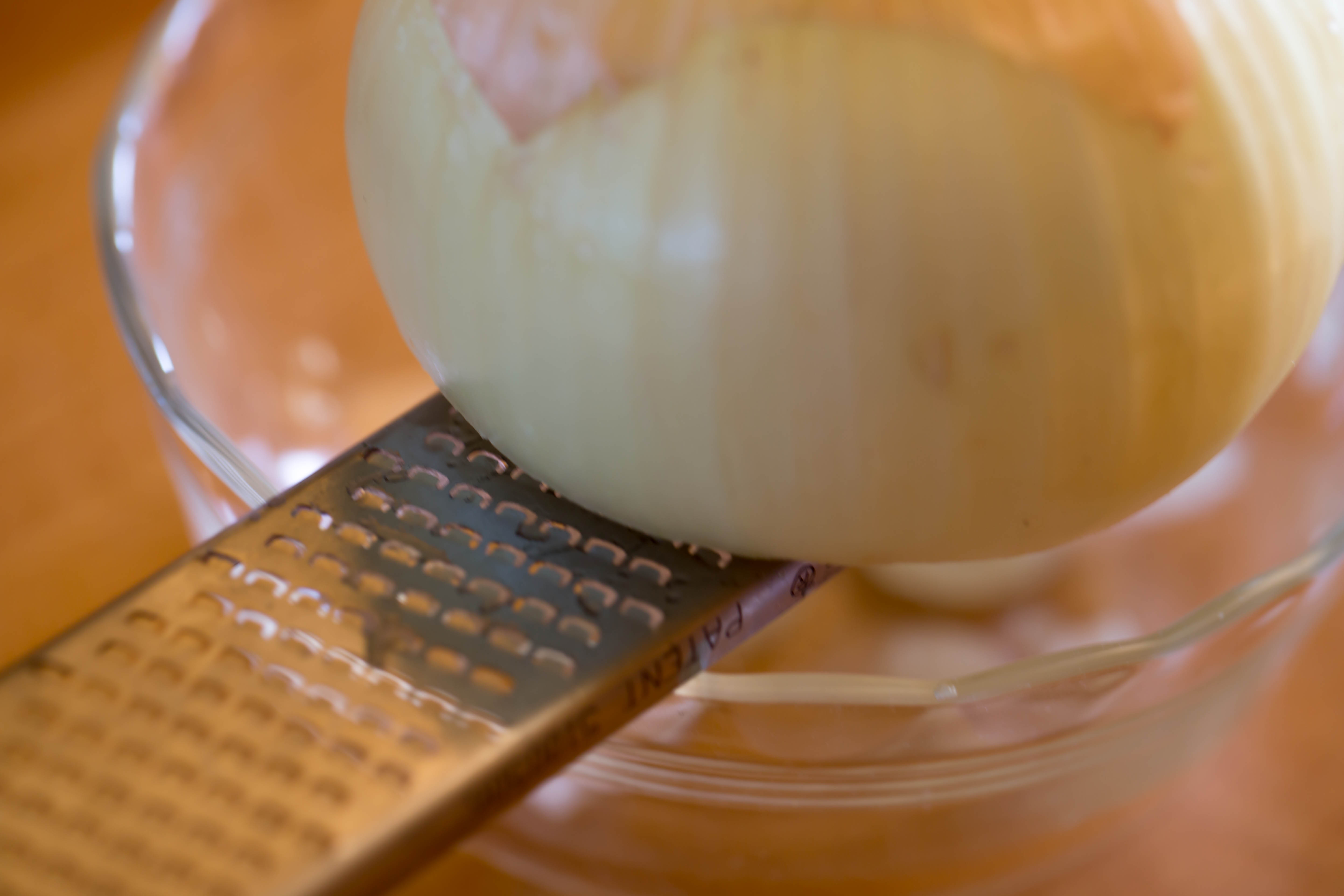 Grating white onion with a micro-plane