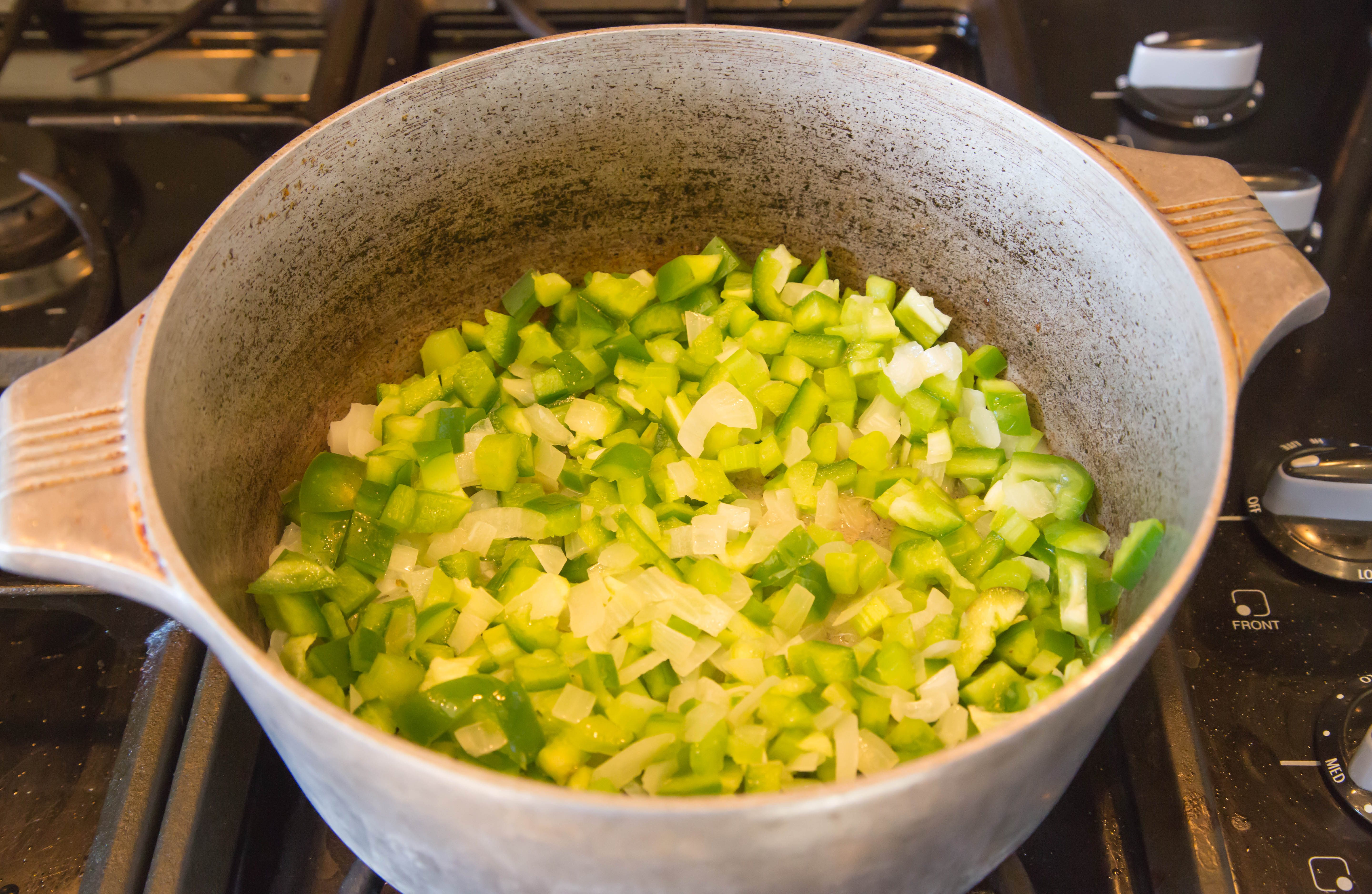 Sautêing the vegetables (onion, celery, green bell pepper)