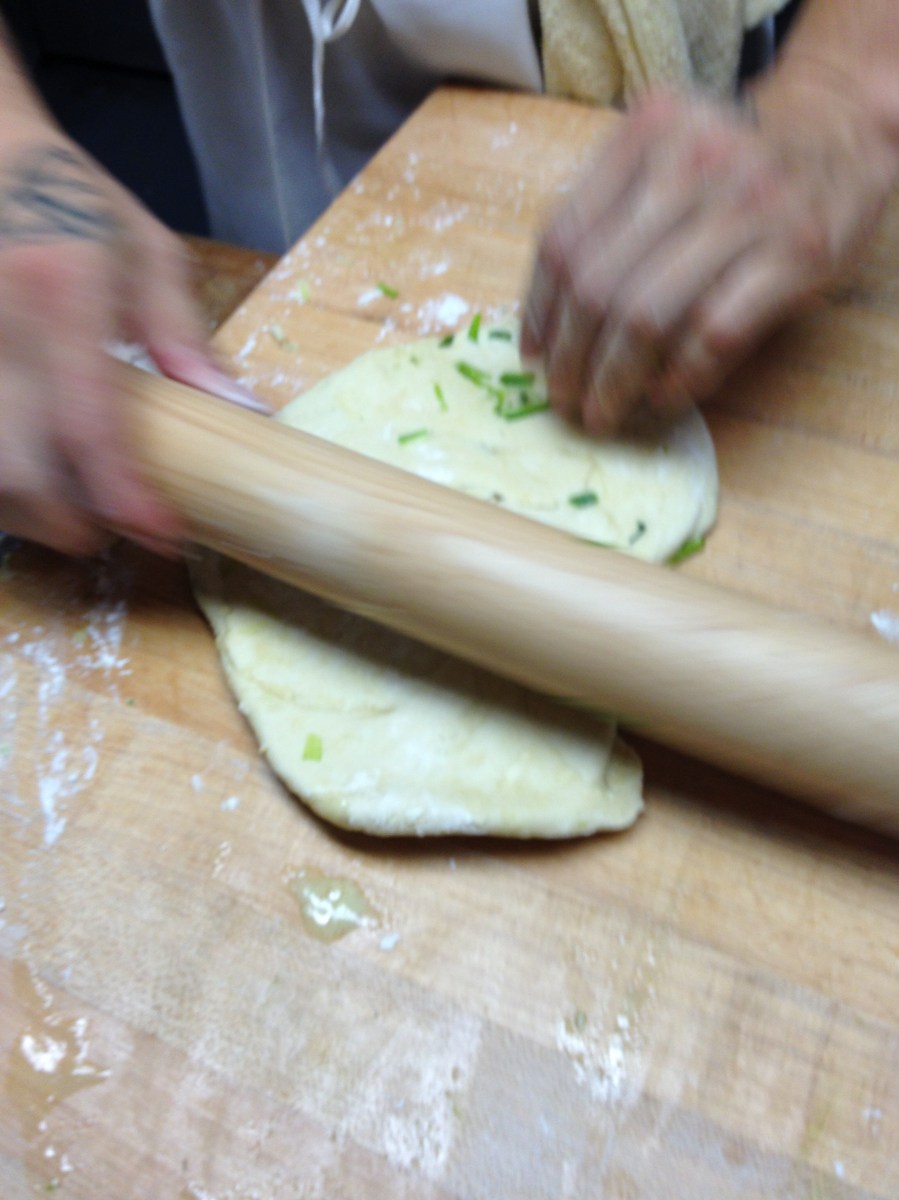 Rolling the scallions into the pancake.