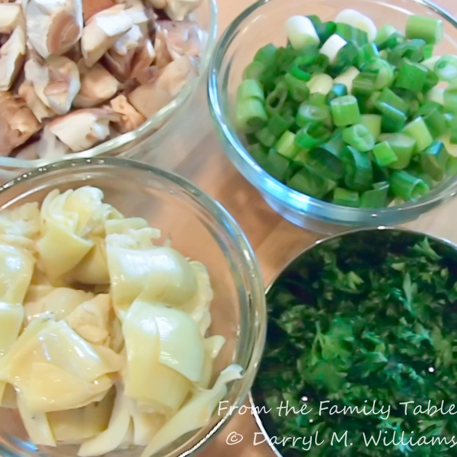 Mushrooms, scallions, parsley, artichoke hearts (clockwise from upper left corner)