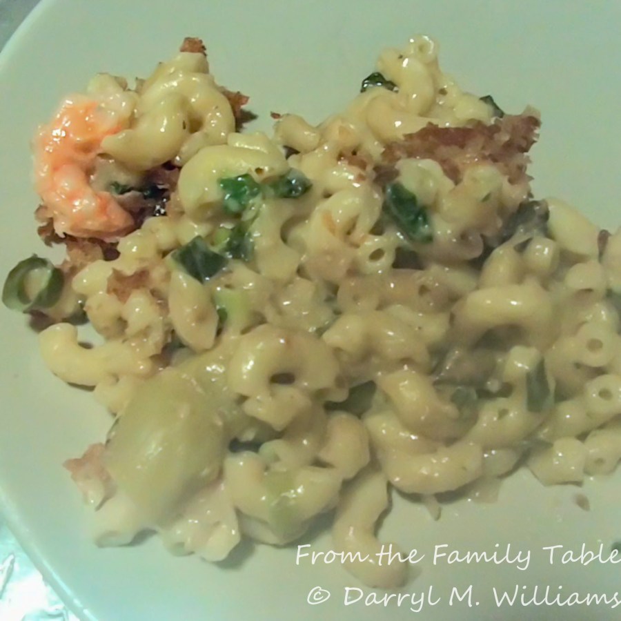 A serving of shrimp, mushroom, artichoke mac and cheese