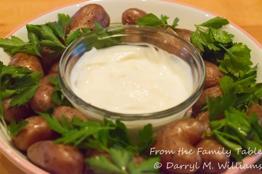 Smoked new potatoes garnished with parsley and served with caramelized garlic aioli.