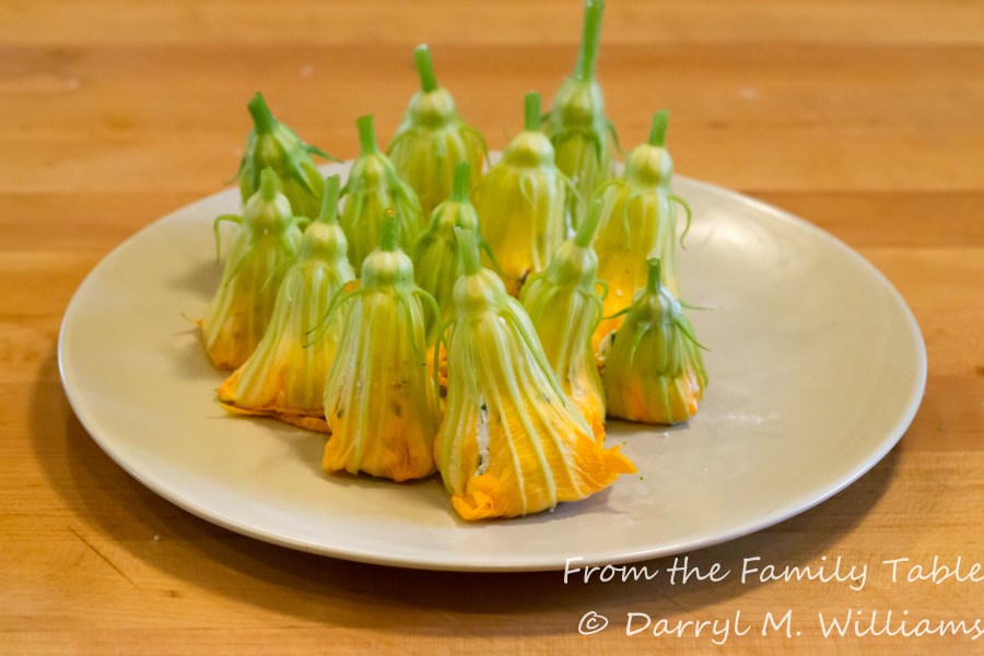 Squash blossoms stuffed and ready for batter and frying