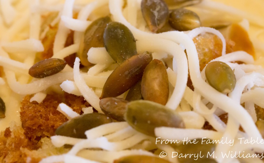 Croutons, grated mozzarella and pepitas