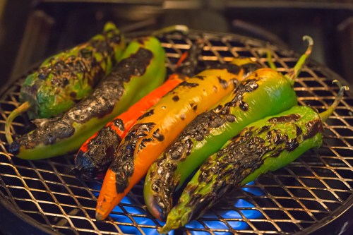 - With long tongs, turn the chiles frequently as they roast. The chiles will become blistered, charred, and black. Don’t be alarmed. That is what you want. Adjust the chiles over the flame so that all sides and all parts become charred.