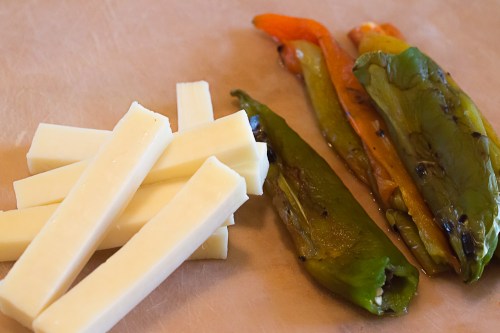 - Cut “fingers” of good melting cheese – Monterey jack, cheddar, mozzarella, Chihuahua, asadero – about ¼ inch x ¼ inch x 4 inches. I like to use fingers of two different cheeses for each stuffed chile. Slide the cheese fingers gently into the chile through the slit. Don’t pack the cheese too tightly or the chile will burst. Not enough cheese and the chile will be undistinguished.