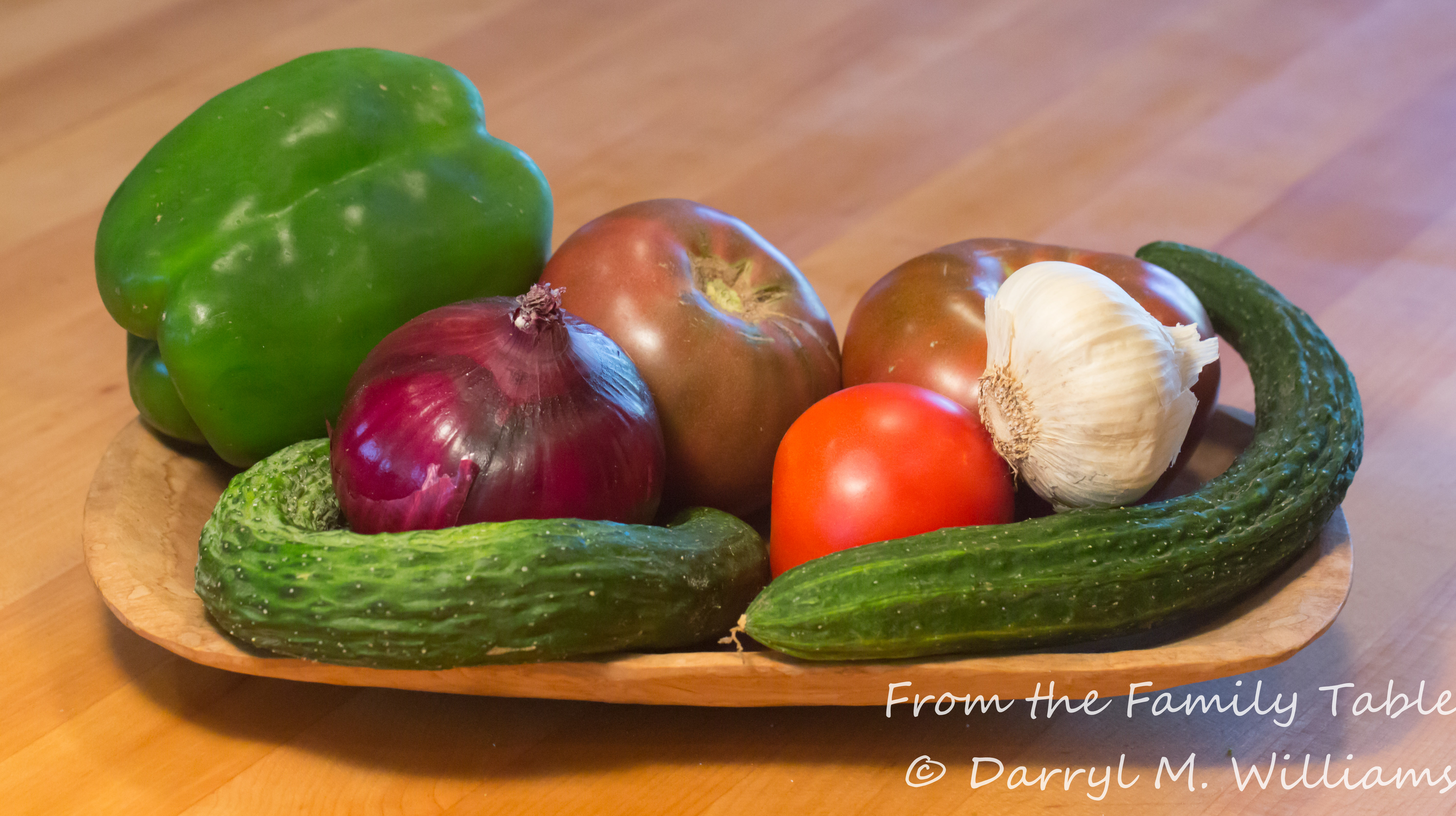 There were lots of tomatoes, peppers, cucumbers, and a red onion in our basket. What could be better to make than a summer soup of gazpacho? Actually, I am not a big fan of most gazpacho. It is often puréed into oblivion and resembles baby food. I much prefer to have identifiable vegetables and crusty garlic croutons. That’s what this recipe is.