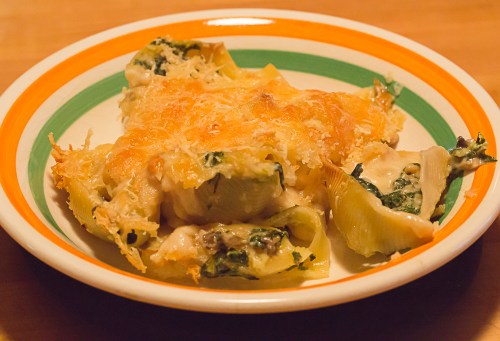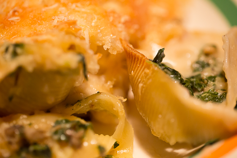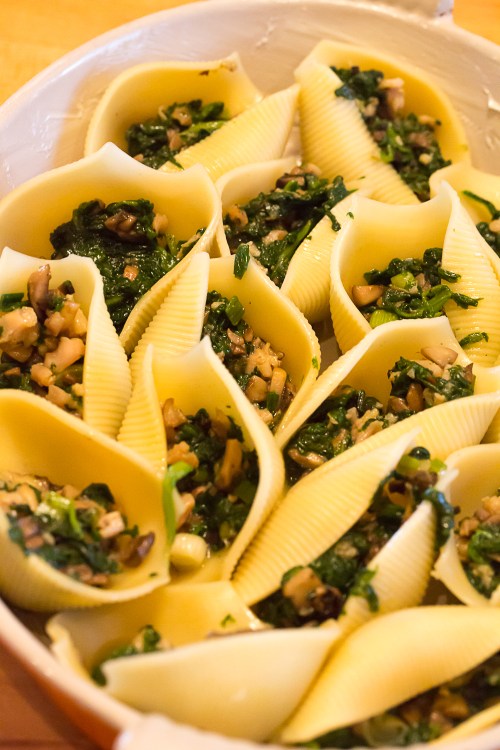 For the appetizer, I was looking for something simple and tasty. There is a recipe for deep-fried cheese-filled wonton wrappers in our family cookbook which served as the beginning idea. A search of the internet revealed a large number of versions of filled wontons, baked or fried, lots of fillings, often centered on crab. Since some of the family have an aversion to crab (How is that possible?), that was out. One of our diners has a great affinity for goat cheese. That was in. I picked shrimp, spinach, and mushrooms as other good stuffing ingredients.