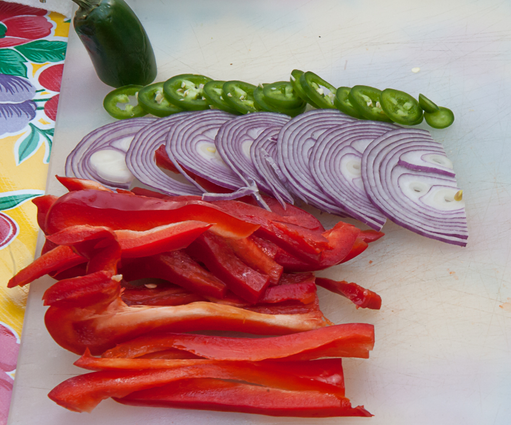 I had to deal with some of the food dislikes within the family. Some don’t like onions or even things that touch onions. Some can’t tolerate piquant chiles because of food sensitivities. Some don’t like avocados. Because of all these variables, I grilled the onions separately from the meat. Instead of classic pico de gallo (rooster’s beak), I made what I call pico de gallina (hen’s beak) without the jalapeños. I omitted the guacamole, but I would encourage you to include it in your choices of fillings.