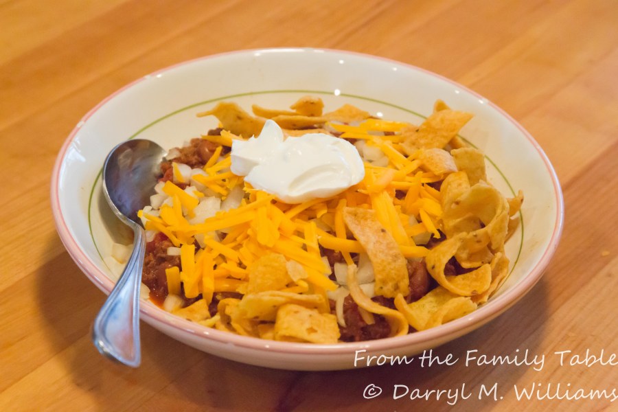 Chili with onion, cheddar cheese, Frito chips and sour cream.